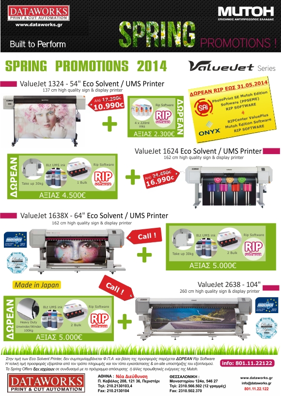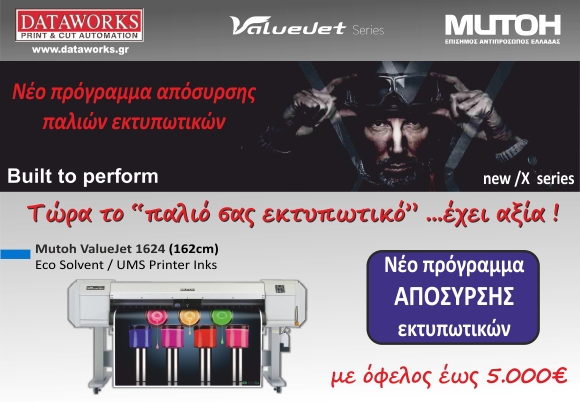 H Mutoh ιδρύθηκε το 1952 στην Ιαπωνία Με άριστη ποιότητα, αποδεδειγμένη αξιοπιστία, αποτελεί την "ασφαλή και σίγουρη λύση". Η Mutoh σήμερα, μόνο στην Ευρώπη, έχει εγκατεστημένα Η νέα, 4η γενιά ValueJet, με απίστευτη ποιότητα εκτύπωσης
